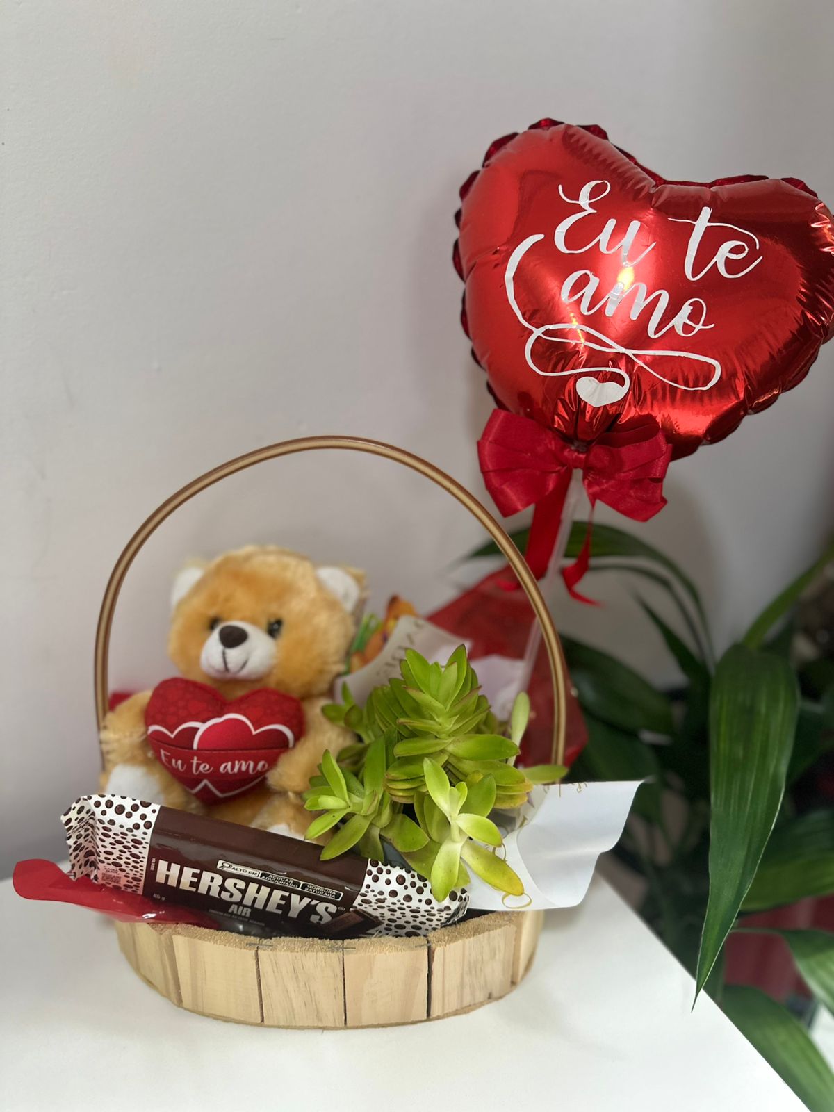 Kit Cesta Oval 1 Urso Pequeno 1 Suculenta Variada pt11 1 Barra de Chocolate Hersheys 1 Balão Metalizado “Eu te Amo”