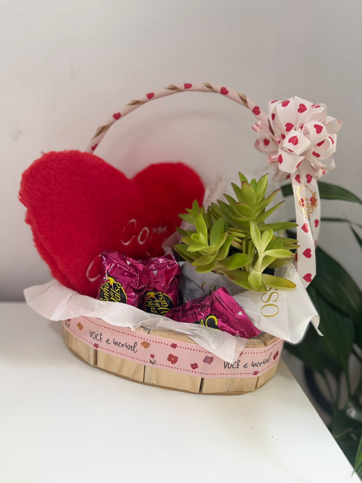 Cesta Oval 1 Coração de Pelúcia 1 Suculenta Variada pt11 3 Bombons Sonho de Valsa
