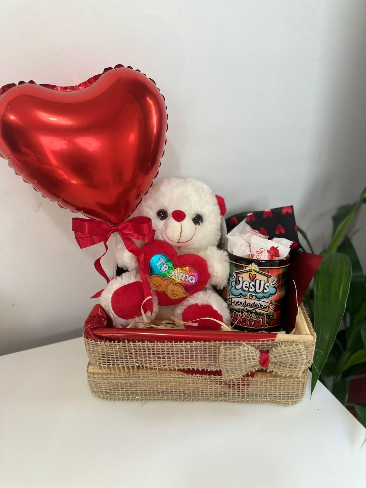 Caixote de Pinos “Te Amo” 1 Urso Te Amo 1 Xícara 5 Bombons Raffaello 1 Balão Metalizado