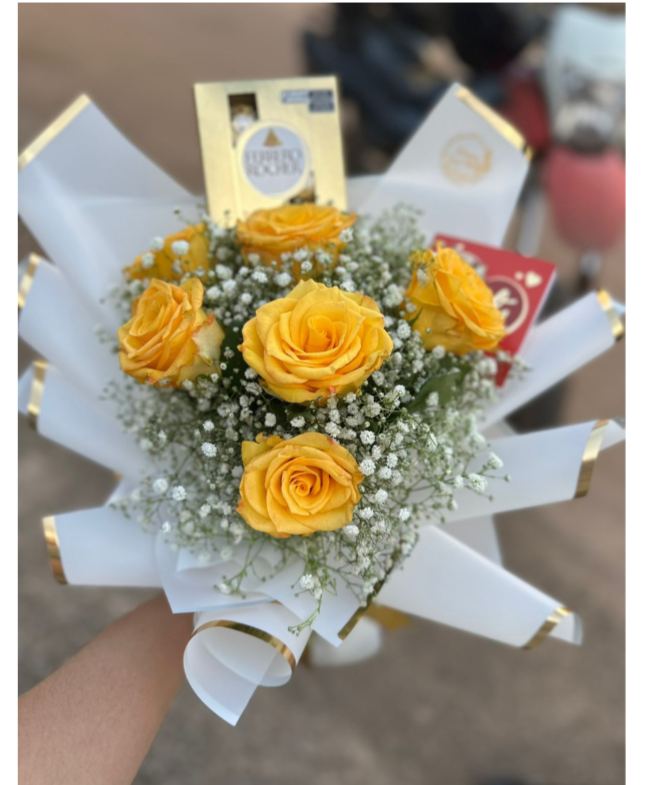 BUQUÊ COM 6 ROSAS AMARELAS, MOSQUITINHO E FERRERO ROCHER T4