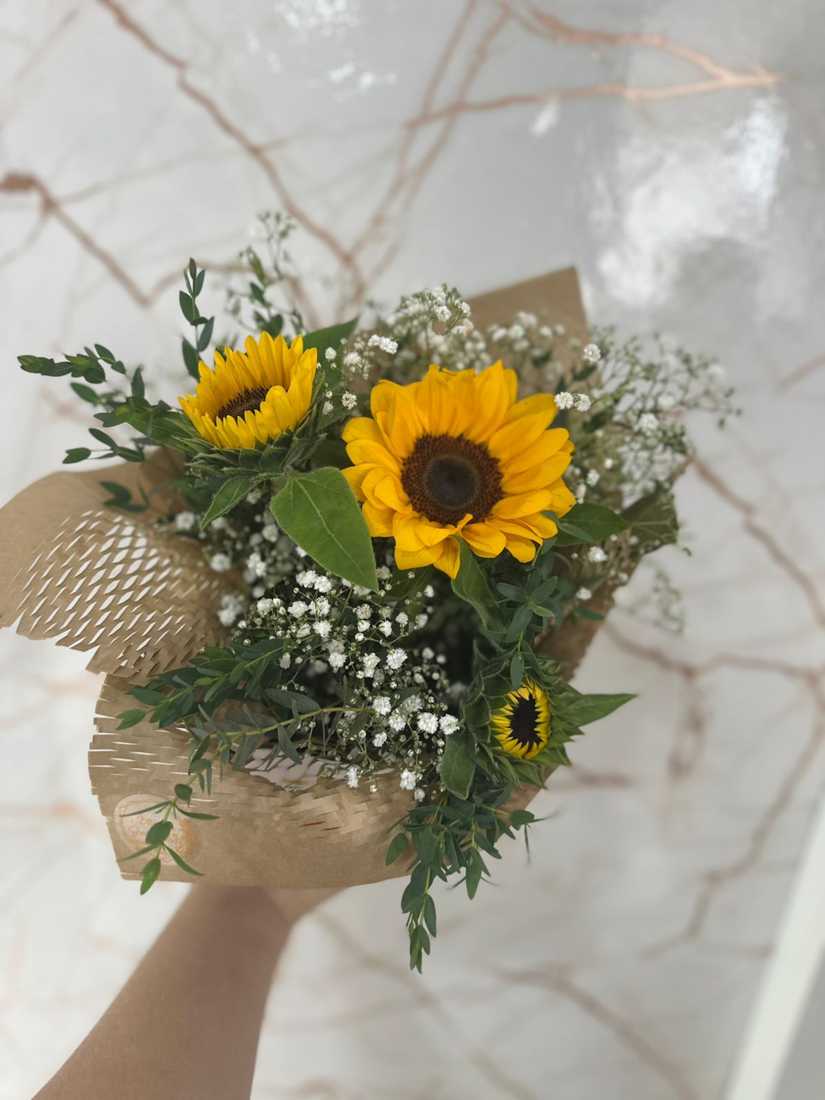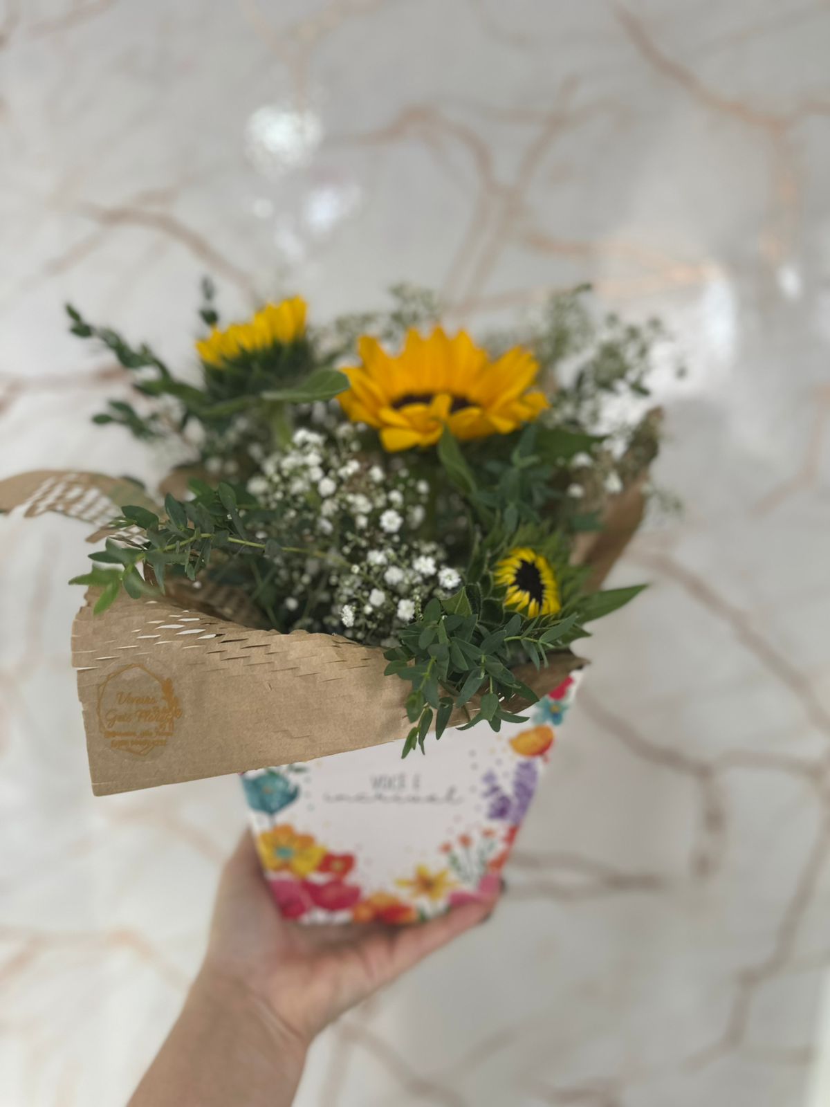 O buquê de girassol simboliza felicidade, energia positiva, lealdade e prosperidade, sendo considerado a "flor da amizade". Devido à sua cor vibrante e capacidade de girar em busca da luz, representa otimismo, admiração e resiliência, ideal para iluminar o dia de alguém, celebrar conquistas ou fortalecer laços afetivos.