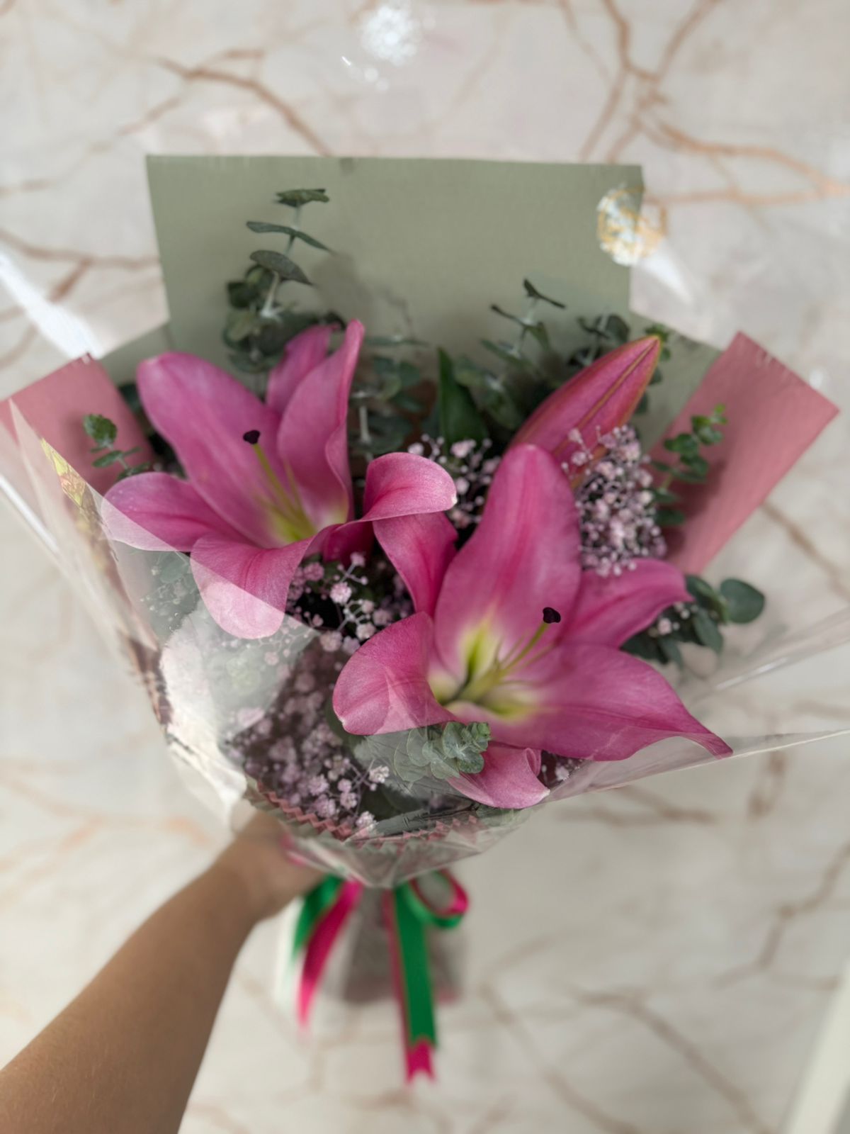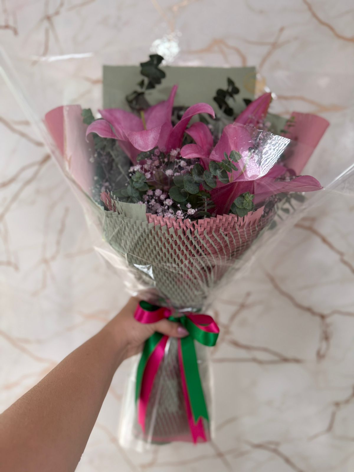 BUQUÊ DE LÍRIO ROSA ASIÁTICO E EUCALIPTOS BABY