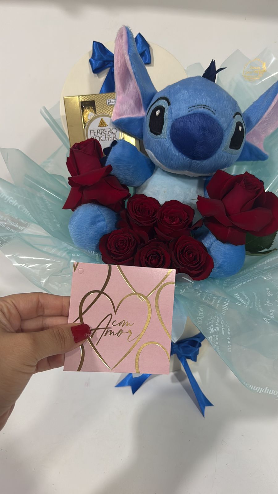 CX BOX CARTONADA COM 7 ROSAS VERMELHAS E PELUCIA STITCH