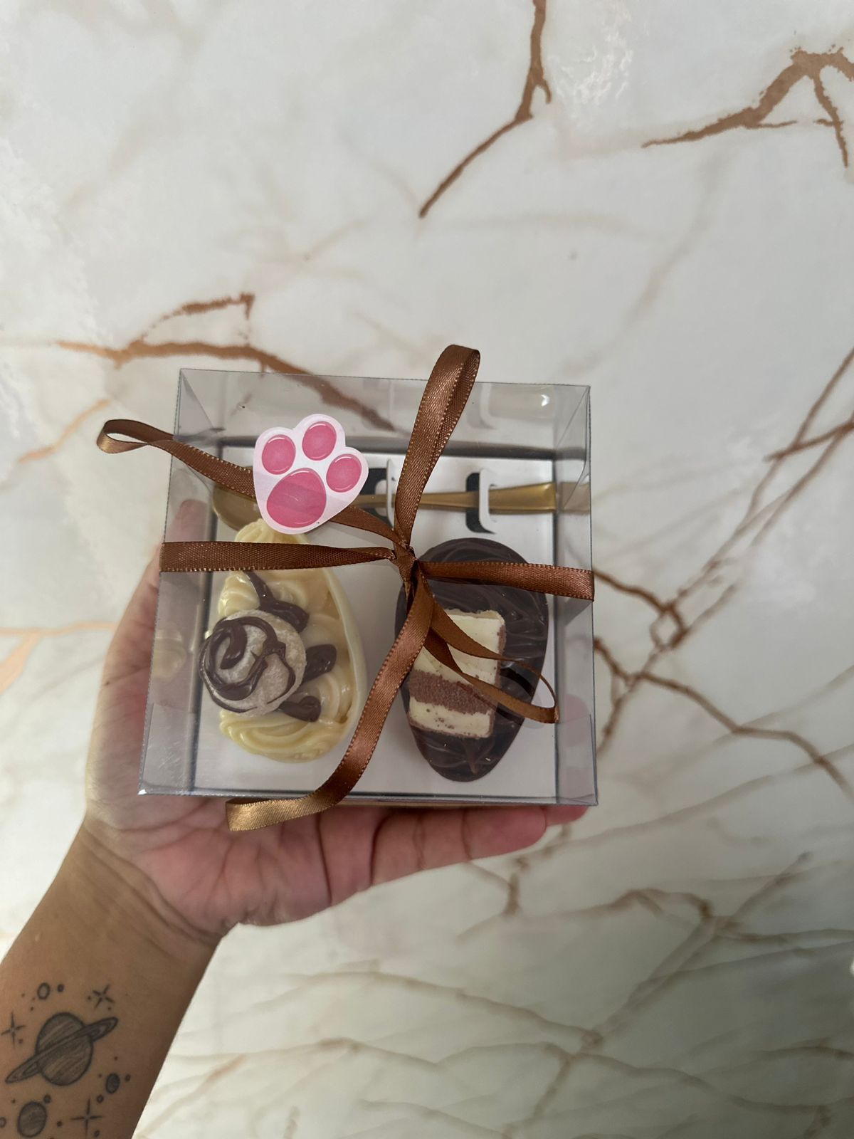 🎁 A apresentação faz toda a diferença: o doce vem em uma elegante caixa de acetato transparente, que valoriza cada detalhe do chocolate e deixa o presente ainda mais sofisticado. O laço em tom marrom e a colher dourada completam o visual, criando um mimo delicado e encantador.
