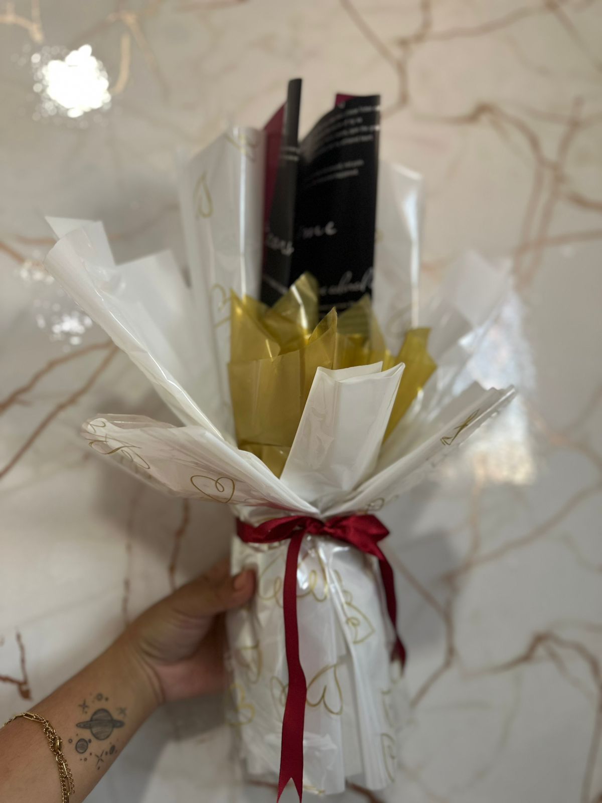EMBALAGENS FLORAL BRANCA/DOURADO COM FUNDO PRETO